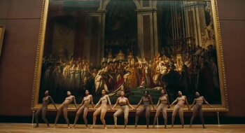 El video muestra a la pareja parada de espaldas a la Gioconda y continúa con bailarinas que parecen estar desnudas bailando, entre otros rincones del museo, frente a La consagración de Napoleón, de Jacques-Louis David.