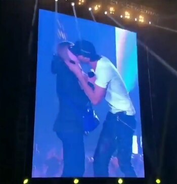 El cantante, de 43 años, estaba interpretando sus canciones populares en Kiev, cuando una mujer saltó al escenario y los dos comenzaron a besarse frente al público.