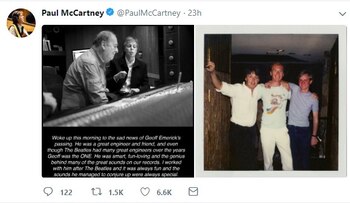 "Nos mantuvimos en contacto a lo largo de los años y nuestras llamadas telefónicas o mensajes siempre nos provocaban una risa o dos", escribió McCartney. "Era él mismo alegre y amigable (este año) y me dio su aprobación para las mezclas que le tocamos. Siempre lo recordaré con mucho cariño y sé que su trabajo será ampliamente recordado por los conocedores del sonido".