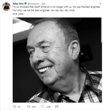El miércoles la viuda de Lennon, Yoko Ono, tuiteó que estaba "en shock" por la muerte de Emerick.