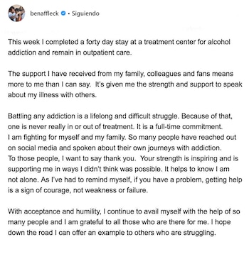 En un sentido mensaje en las redes sociales, el protagonista y director de Argo agradeció el apoyo del público y de su familia en este difícil momento personal: "Ayuda saber que no estás solo". También reconoció que su adicción es una "difícil lucha de por vida".