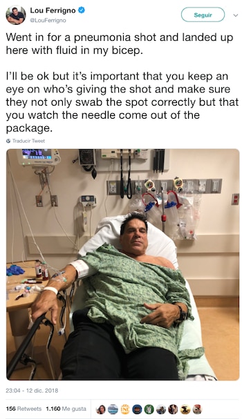 "Fui por una vacuna contra la neumonía y terminé aquí con fluidos en mis bíceps", escribió Ferrigno en su cuenta de Facebook. El texto acompaña una foto en la cual se le ve acostado en una cama de hospital, con sueros y equipos de medir la presión arterial en su brazo derecho.