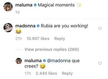 En octubre Maluma publicó una imagen sentado en un estudio de grabación y Madonna le comentó: "Rubia, estás trabajando". El colombiano respondió: "¿Qué cree? (emoji de risa)".