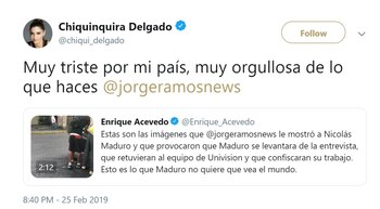 Delgado publicó en Instagram un tuit del periodista colombiano Daniel Coronell, en donde informaba de la retención arbitraria de Jorge Ramos y su equipo en el Palacio de Miraflores, en Caracas.