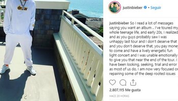 Bieber comentó que para él la música es muy importante, pero lo es más su familia y su salud. "Regresaré con un álbum tan pronto como pueda", aseguró. Después, en algo que parecía ser referencia a Dios, el cantante escribió "su amor es supernatural, su gracia es tan confiable, la cima es donde estoy. Ya sea que haga música o no, el rey dirá".