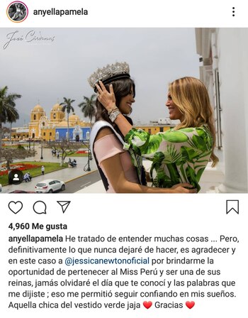 "He tratado de entender muchas cosas … Pero, definitivamente lo que nunca dejaré de hacer, es agradecer y en este caso a @jessicanewtonoficial por brindarme la oportunidad de pertenecer al Miss Perú y ser una de sus reinas, jamás olvidaré el día que te conocí y las palabras que me dijiste, eso me permitió seguir confiando en mis sueños. Aquella chica del vestido verde jaja Gracias".
