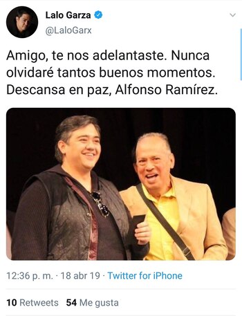 El actor de doblaje Lalo Garza compartió una imagen junto a Ramírez y lamentó a través de un mensaje en Twitter el fallecimiento de su colega.