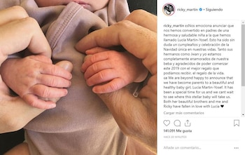 "Nos emociona anunciar que nos hemos convertido en padres de una hermosa y saludable niña a la que hemos llamado Lucía Martin-Yosef. Esto ha sido sin duda un cumpleaños y celebración de la Navidad única en nuestras vidas", escribió Ricky para acompañar la fotografía donde se veían las manitas de la bebé junto a las manos de sus padres.