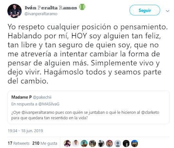 Y es que algunos usuarios que recuerdan el mediático romance entre los dos hombres, han contactado vía Twitter a Iván Peralta para preguntarle sobre Mauricio. Él ha sido franco sobre su postura, y de paso ha dejado claro que, a diferencia de su ex, él no quiere cambiar la forma de ser y pensar de los demás.