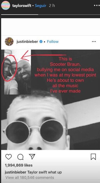 En su mensaje que publicó en Instagram, la cantante pop aseguró que el ahora propietario de Big Machine Label Group la atacó vía redes sociales, junto a Justin Bieber y Kanye West. Tras la publicación, en Twitter se hizo tendencia el hashtag #WeStandWithTaylor.