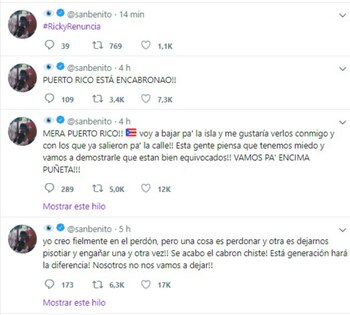 En uno de sus recientes mensajes utilizó el hashtag #RickyRenuncia y aseguró que su país está "encabronao".
