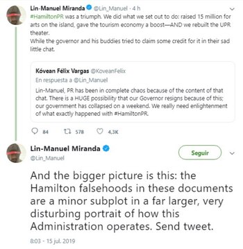 A esas voces se ha sumado la del actor, cantante y dramaturgo Lin-Manuel Miranda, que se refirió a una parte específica del chat en la que se alegraron de que la presentación de su musical Hamilton se cancelara en el teatro de la Universidad de Puerto Rico (UPR) para llevarse al Centro de Bellas Artes en el sector Santurce de San Juan, por razones de seguridad.