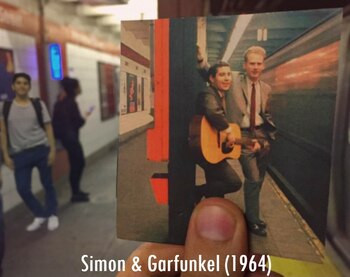 Simon y Garfunkel, en la imagen que fue elegida para la tapa de Wednesday Morning, 3AM, álbum debut del dúo. Garfunkel contó que en la sesión se tomaron cientos de fotos que fueron descartadas por las inscripciones en las paredes de la estación, lo que a la larga lo inspiraría para una canción del siguiente disco.