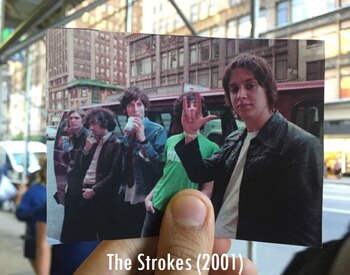 The Strokes, una de las mejores bandas de Nueva York del siglo XXI, retratada en un momento en el que estaban a punto de saltar a la fama. El grupo de rock-indie fue reunido por el fotógrafo Cody Smyth afuera del Music Building. Se formaron en fila y posaron ante la cámara. "¿Quieres venir con nosotros?", lo invitaron. Esa noche tenían un show en Filadelfia. En el público, estaban los hermanos Gallagher, de Oasis. Pocos meses después se lanza el álbum Is This It, que fue un gran éxito y abrió la puerta a otras bandas de rock alternativo.