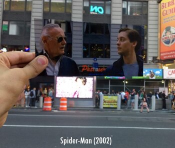 También en Times Square se registró uno de los numerosos "cameos" de Stan Lee, escritor de cómics de Marvel, quien no perdía oportunidad para aparecer brevemente en las películas de superhéroes.