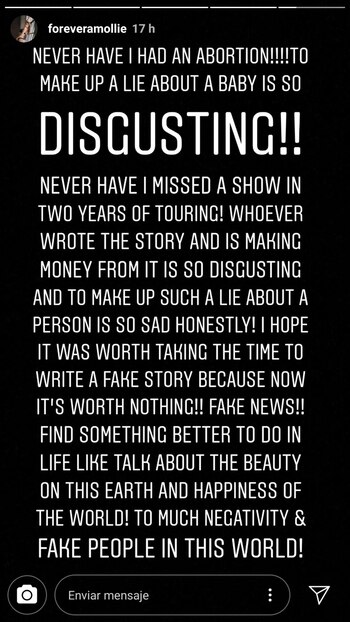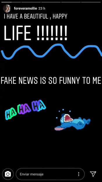 En ese mismo mensaje, Mollie pidió a las personas que busquen "algo mejor que hacer con su vida, hablen de la belleza del planeta, de la felicidad del mundo, demasiada negatividad y gente falsa en este mundo".