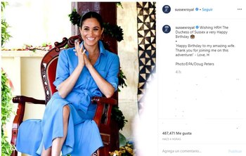 Hace unas horas se publicó en la cuenta de los duques de Sussex una fotografía de Meghan, sonriente y luciendo un vestido azul, y un mensaje que dice: "Deseando un feliz cumpleaños a su alteza real, la duquesa de Sussex".