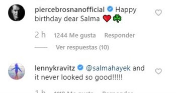 Entre los cientos de comentarios que recibió, varios famosos se manifestaron, como el cantante Lenny Kravitz, quien le escribió "nunca se vio tan bien", mientras que Pierce Brosnan, ex intérprete de James Bond, le deseó feliz cumpleaños.