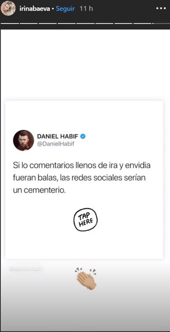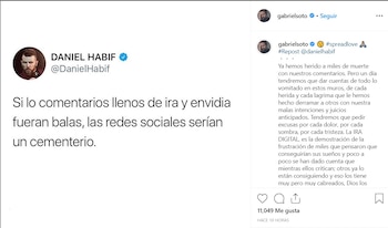 Hace unas horas compartió en la red social, en la que tiene más de tres millones de seguidores, un mensaje del escritor Daniel Habif que dice: “Si los comentarios llenos de ira y envidia fueran balas, las redes sociales serían un cementerio”.