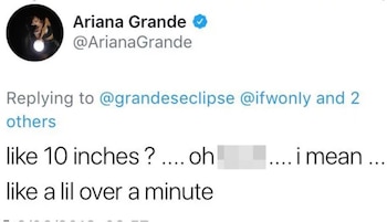 Por supuesto las bromas y memes se desataron en la red social y la misma Ariana se burló del asunto cuando en otro tuit escribió "como 10 pulgadas.. oh... quiero decir... como poco más de un minuto".