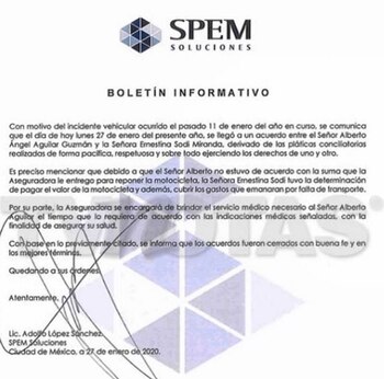El ajustador de General de Seguros analizó la escena e indicó que la motocicleta del repartidor era pérdida total por lo que le dio la documentación necesaria para que recibiera atención médica, puesto que la aseguradora se haría cargo de los gastos, y en caso de que no ocurriera así, Ernestina Sodi correría con los gastos.
