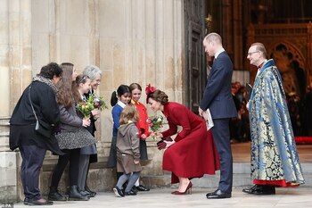 Kate Middleton, en cambio, olvidó las recomendaciones y a la salida de la iglesia tomó las flores del puño de una niña que la estaba esperando en la puerta.