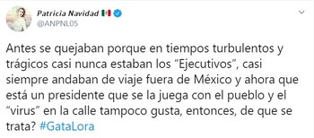 En si siguiente tuit, Navidad comentó que no apoya a ningún político ni gobernante, pero se identifica y es empática con la mayoría de los mexicanos, pues le afecta que los más vulnerables sean quienes peor la están pasando. Aprovechó además para agradecer que desde el Gobierno no se haya infundido miedo a la gente.