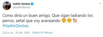 Derbez no se quedó callado y tras la ola de críticas y ataques en su contra, publicó en su cuenta de Twitter un contundente mensaje a manera de respuesta: “Como diría un buen amigo, Que sigan ladrando los perros, señal que voy avanzando”.