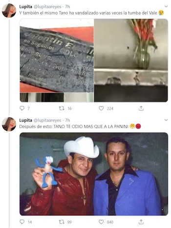Tano Elizalde ha vandalizado en varias ocasiones la tumba de Valentín. Según la esposa, quien se encuentra ya en proceso de divorcio, Tano sufre de adicciones y Valentín quiso internarlo varias veces en un centro de rehabilitación, pero él se opuso.