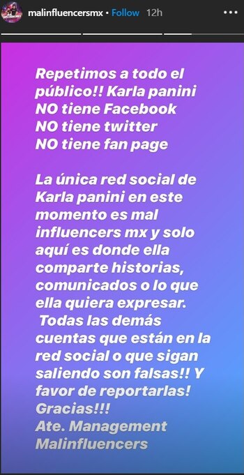 "La única red social de Karla Panini en este momento es malinfluencersmx y solo aquí es donde ella comparte historias, comunicados o lo que ella quiera expresar. Todas las demás cuentas que están en la red social o que sigan saliendo son falsas y favor de reportarlas".