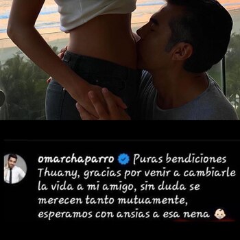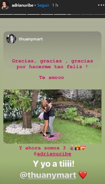 Thuany compartió en Instagram stories una imagen abrazando a Uribe y escribió “gracias por hacerme tan feliz, te amo. Y ahora somos 3”, a lo que Uribe respondió con “yo a ti”.