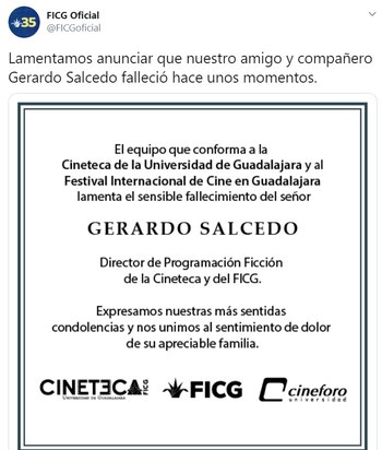 “En FilmotecaUNAM lamentamos profundamente el fallecimiento de Gerardo Salcedo, colaborador histórico en diversos proyectos, profesor en @UNAM_FCPyS y actualmente Director de Programación Ficción de la @CinetecaFicg y del @FICGoficial”, decía otro de los mensajes sobre el deceso.