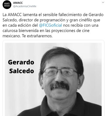 “La AMACC lamenta el sensible fallecimiento de Gerardo Salcedo, director de programación y gran cinéfilo que en cada edición del @FICGoficial nos recibía con una calurosa bienvenida en las proyecciones de cine mexicano. Te extrañaremos”.