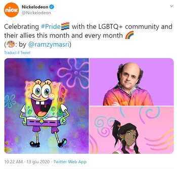 La publicación del canal con motivo del Mes del Orgullo, en la que aparece el popular personaje de dibujos animados pintado con los colores del arco iris, símbolo de la comunidad LGBTQ +, abrió el debate en Twitter sobre si Nickelodeon estaba finalmente admitiendo que Bon Esponja es gay.