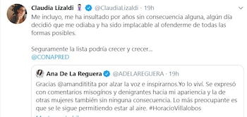 Claudia Lizaldi se sumó a esas voces y escribió en Twitter: “Me incluyo, me ha insultado por años sin consecuencia alguna, algún día decidió que me odiaba y ha sido implacable al ofenderme de todas las formas posibles”.