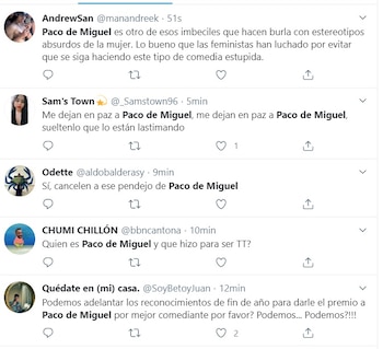 Si bien hubo algunas voces que se alzaron contra él, fueron las menos, pues en realidad gran cantidad de comentarios hacían referencia a su humor blanco y a que De Miguel no sería "cancelado".