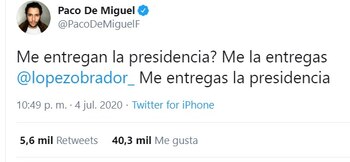 Todo se desató a raíz de que escribió el sábado por la noche: “¿Me entregan la presidencia? ¿Me la entregas @lopezobrador? ¿Me entregas la presidencia?”.