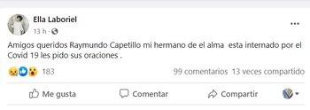 “Amigos queridos, Raymundo Capetillo, mi hermano del alma, está internado por el Covid 19, les pido sus oraciones”, escribió en su cuenta de Facebook.