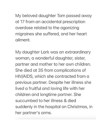 “Mi amada hija Tam falleció a los 17 años de una sobredosis accidental relacionada con las migrañas agonizantes que sufría y su enfermedad cardíaca”, explica Farrow.