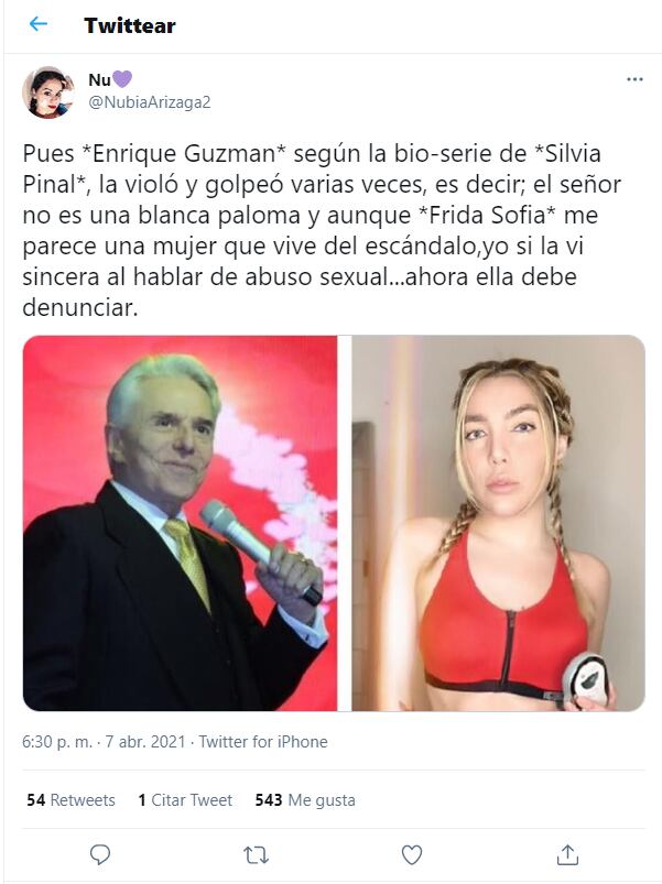“Pues Enrique Guzmán, según la bio-serie de Silvia Pinal, la violó y golpeó varias veces, es decir; el señor no es una blanca paloma y aunque Frida Sofia me parece una mujer que vive del escándalo, yo si la vi sincera al hablar de abuso sexual...ahora ella debe denunciar!”, escribió otra persona en Twitter respecto al caso.