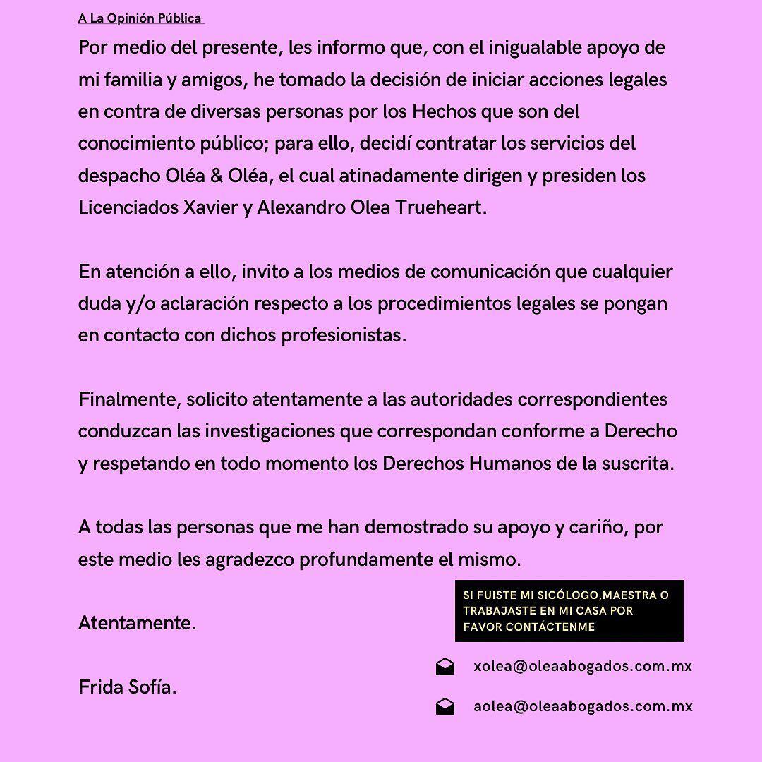 Quienes llevarán a cabo el caso de Frida Sofía será el despacho Olea & Olea, el cual presiden los hermanos Olea Trueheart. Asimismo, la modelo pide acudir a ellos en caso de tener dudas acerca de los procedimientos legales que llevarán a cabo.