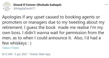 Años después O´Connor reconoció padecer de trastorno bipolar y preocupó a sus fans en más de una oportunidad, sobre todo en los últimos tiempos, con publicaciones en redes sociales en donde alertaba sobre su mal estado psíquico.
