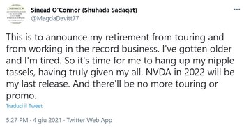 La cantante irlandesa Sinéad O`Connor anunció que se retirará definitivamente de la música cuando en enero de 2022 lance “No Veteran Dies Alone”, su nuevo disco de estudio.