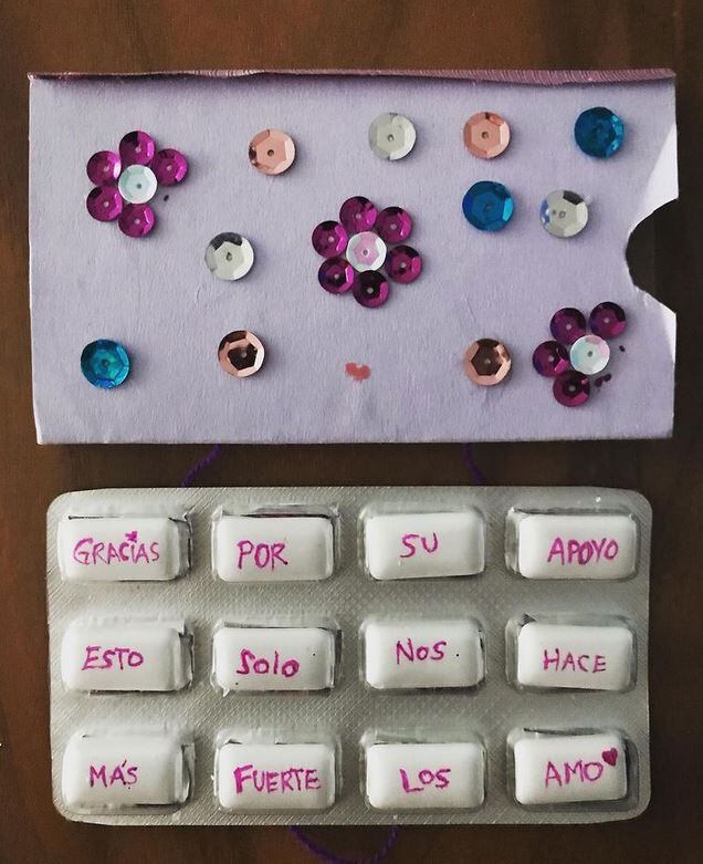 No es la primera manualidad ni el primer mensaje que muestra la también actriz desde que fue vinculada a proceso. El pasado 15 de julio su novio compartió a través de su cuenta de Instagram una caja de chicles, en donde cada pastilla, en su sección de plástico correspondiente, tenía escrita una palabras.