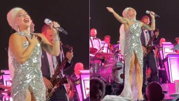 La cantante estadounidense fue una de las invitadas principales del evento que subió al escenario para deleitar a los asistentes con su interpretación junto a una numerosa banda. Gaga brilló en la noche con un estupendo vestido semitransparente con una amplia abertura a la altura de las piernas.