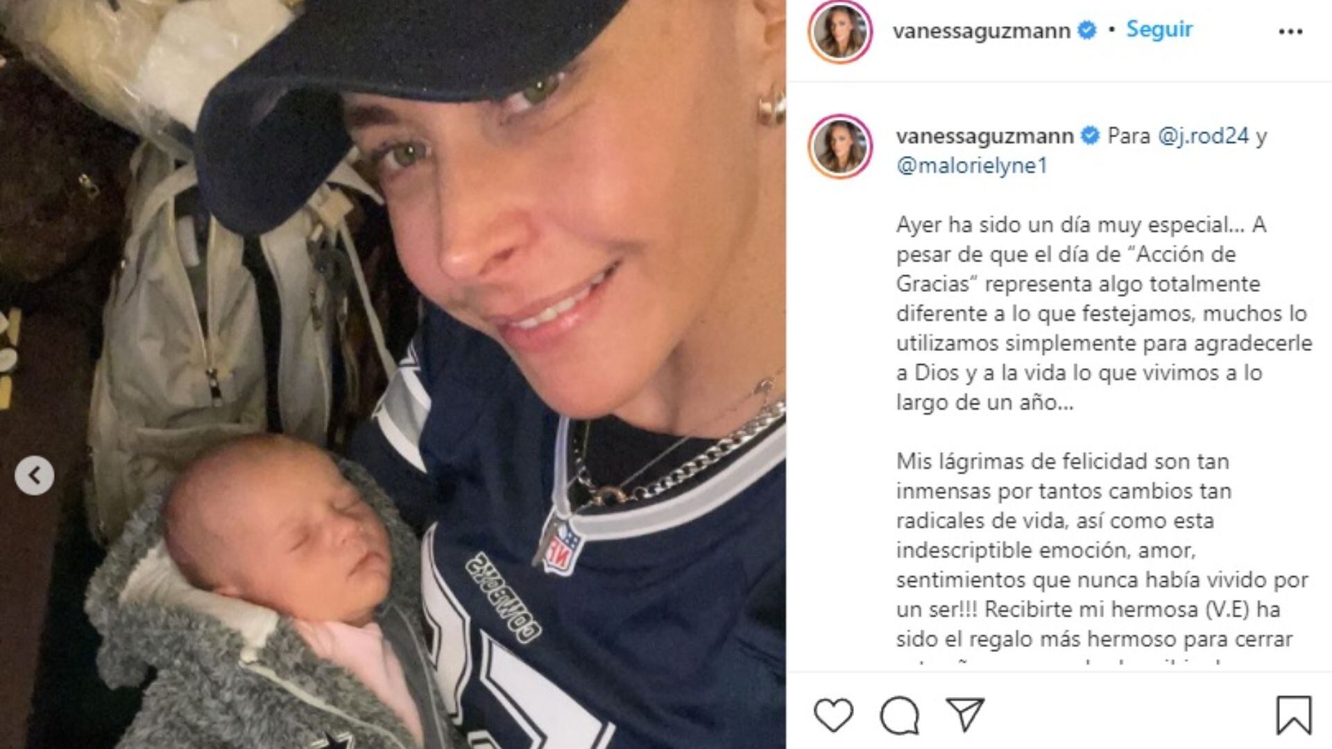 El pasado Día de acción de gracias, Vanessa Guzmán sorprendió a sus seguidores de redes sociales con una fotografía muy especial. La oriunda de Ciudad Juárez, Chihuahua subió una selfie a su cuenta de Instagram donde posó cargando a su nieta de aproximadamente un mes de edad. La actriz apareció ente la cámara luciendo un jersey de Dallas Cowboys y una gorra mientras que la bebé estaba dormida y bien abrigada con un mameluco.