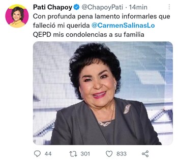 Pati Chapoy, conductora del programa de espectáculos Ventaneando lamentó profundamente esta irreparable pérdida y envió condolencias a la familia de Carmen Salinas. Por su parte, Juan José “Pepillo” Origel también se sumó a los mensajes y compartió una imagen junto con su “querida Carmen Salinas”.