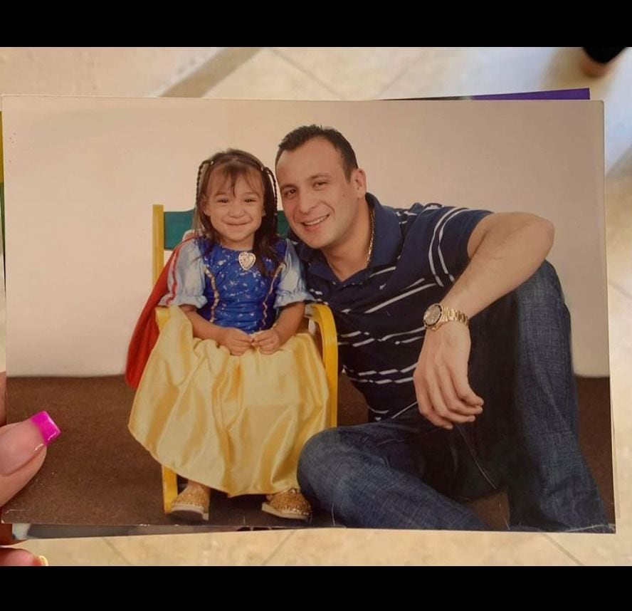 Valentina también publicó una foto la época en que era niña, en la imagen se le ve vestida de la princesa Blancanieves mientras El Gallo de Oro posaba a su lado en lo que parece ser alguna fiesta infantil.