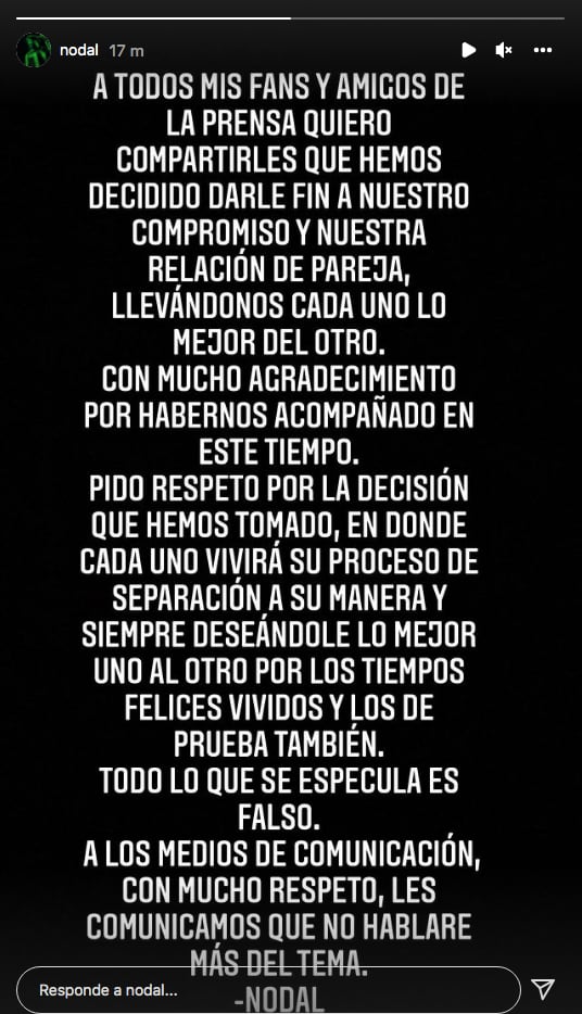 “A los medios de comunicación, con mucho respeto, les comunicamos que no hablaré más del tema. Nodal”, concluyó.