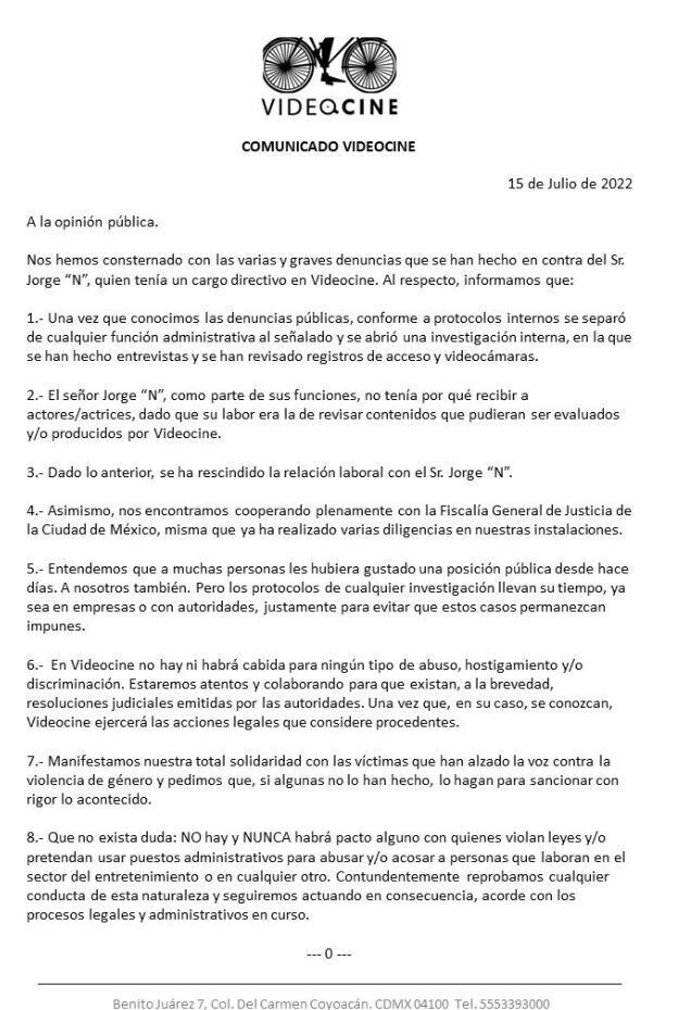 “El señor Jorge ‘N’, como parte de sus funciones, no tenía por qué recibir actores/actrices, dado que su labor era revisar contenidos que pudieran ser evaluados y/o producidos por Videocine”.